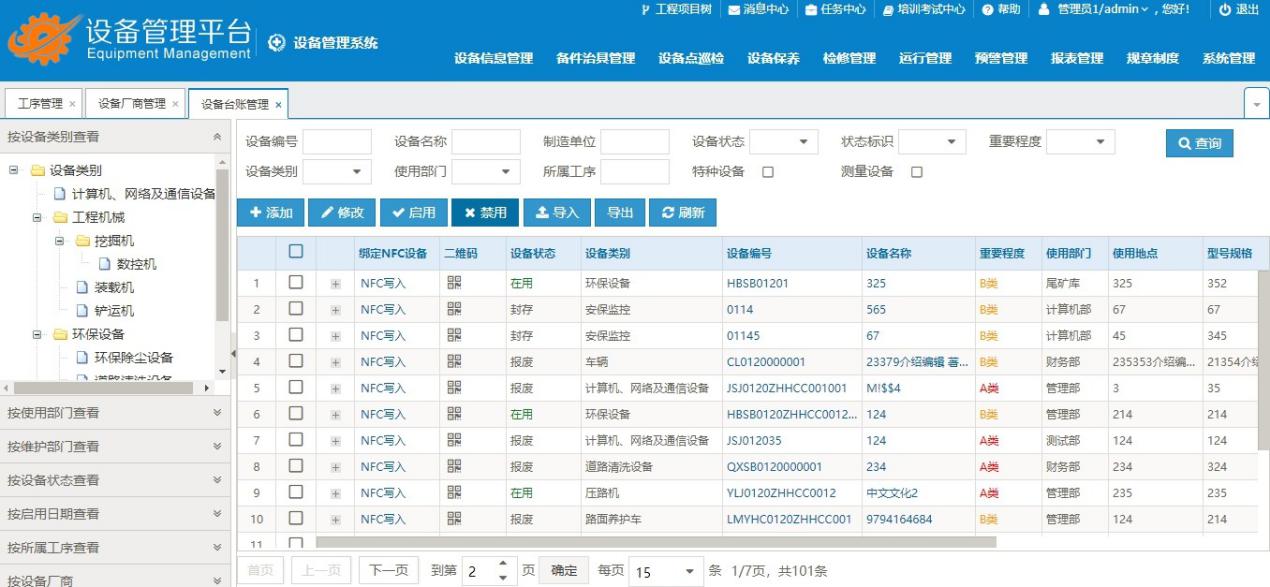 設備基礎臺賬是設備管理系統(tǒng)的基礎模塊,與每個設備管理業(yè)務管理,與集團物資分類管理和分類編碼關聯,包括設備分類目錄,設備列表、添加、修改、啟用、信息導入、信息導出等,設備屬性包括設備編號、設備名稱、設備類別、制造單位、狀態(tài)標識、重要級別、運行狀態(tài)、維修記錄、使用部門及負責人、所屬工序,附查詢功能。