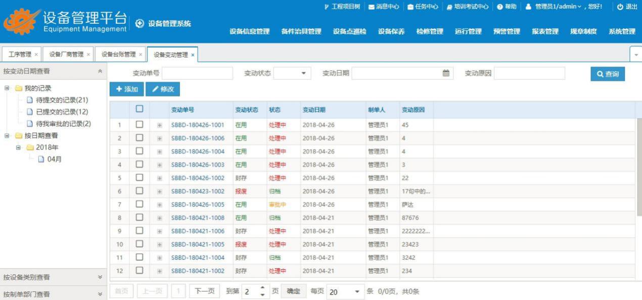設備變動由于設備的折舊、挪用、報廢、跟換、變賣等因素而管理,包括設備變動編號、狀態(tài)、變動日期、變動原因等,有添加、修改、刪除、搜索功能。