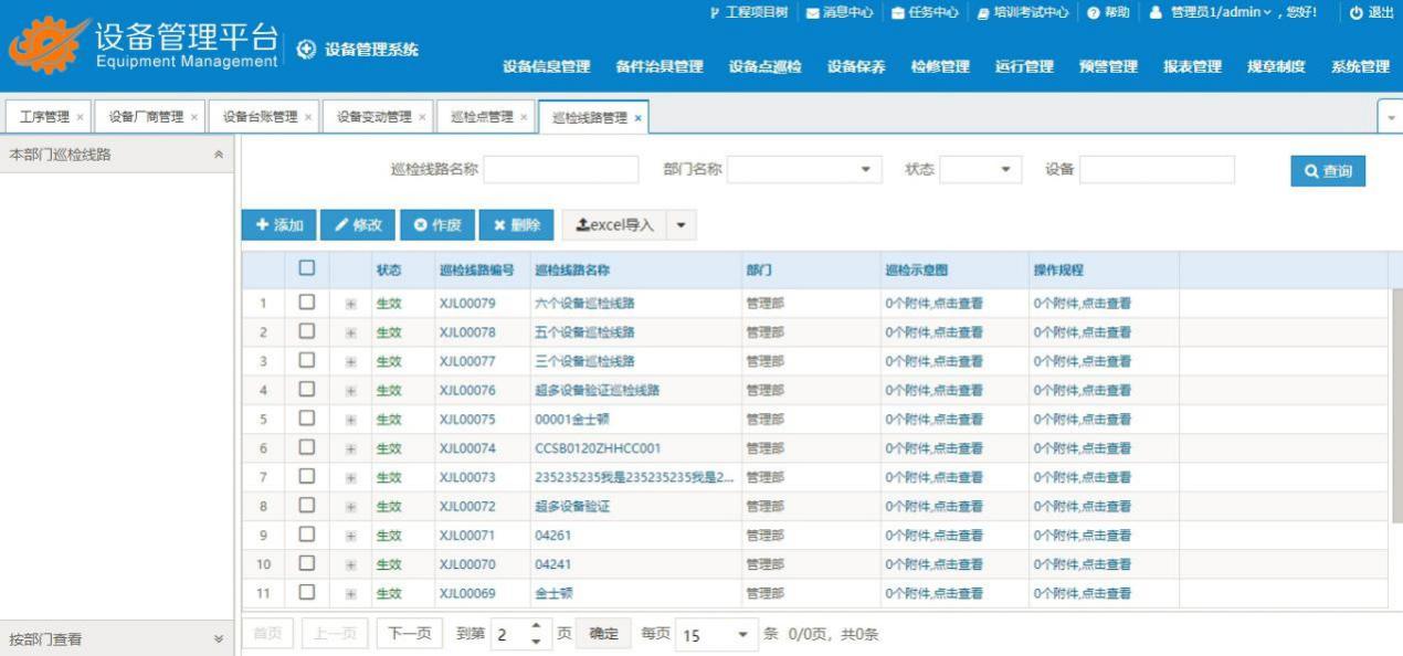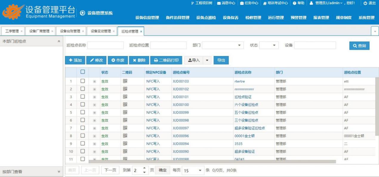 巡檢點信息管理,巡檢點可以關聯多個設備,設備關聯巡檢項目;功能包括:新增、修改、刪除、作廢、導出、導入。點屬性包括:名稱、位置、歸屬部門、狀態(tài)、設備編碼、點編號、設備綁定寫入情況。