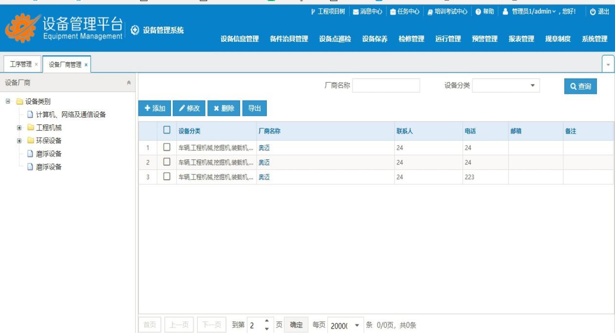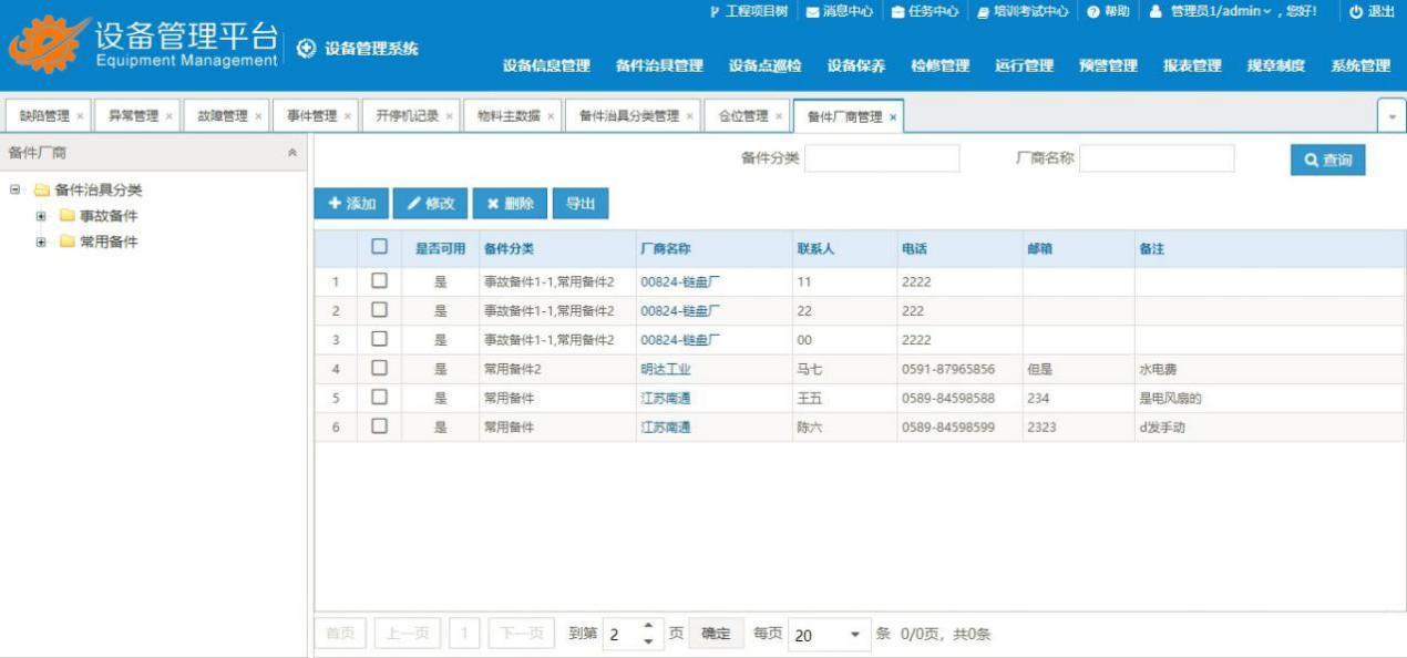 設備廠商管理,包括設備廠商的增刪改查操作,同時,可以對廠商和設備分類進行合并搜索。