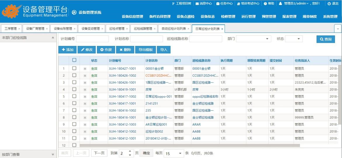 根據巡檢線路手動添加巡檢計劃,根據巡檢周期自動生成巡檢任務,功能包括:新增、修改、作廢、刪除。