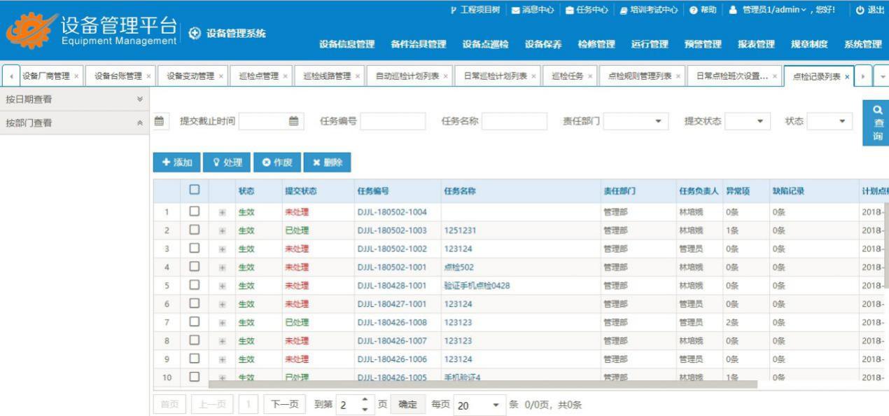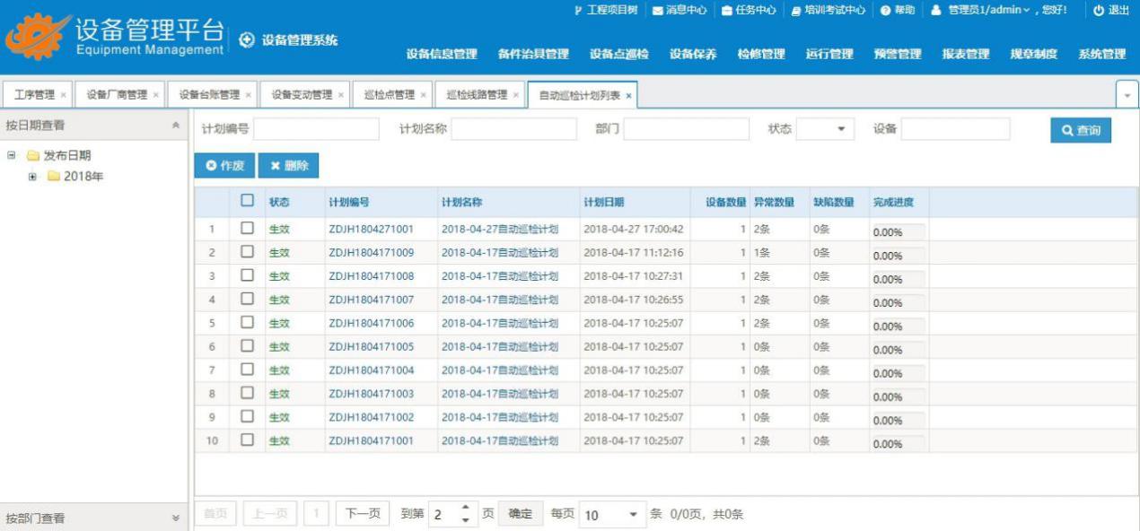 根據設備巡檢周期自動生成巡檢計劃和巡檢任務,根據完成程度顯示進度,功能包括:作廢、刪除。實現系統(tǒng)根據設備巡檢周期自動發(fā)起。