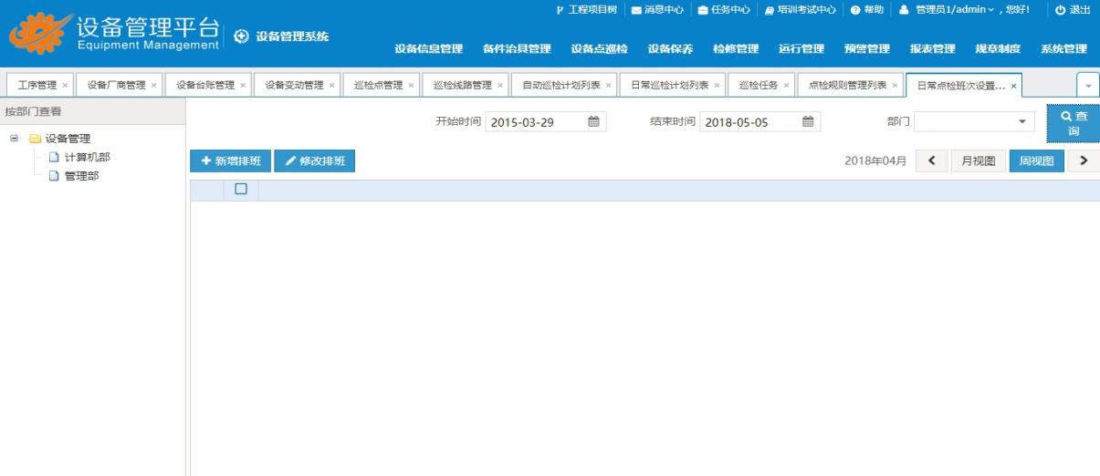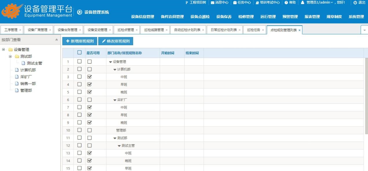 日常巡檢班次設置,功能包括:新增、修改、作廢、刪除、導入、導出。