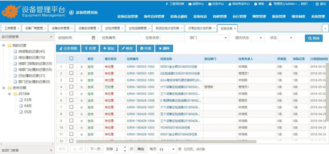 根據巡檢計劃指定的任務人,任務人領取相應任務,并執(zhí)行巡檢任務,顯示個人任務情況,功能包括:任務領取、處理、作廢等。包括:狀態(tài)、處理狀態(tài)、編號、名稱、責任部門、責任人、設備數量、異常數量、缺陷數量、完成進度等,日常巡檢的班次設置。