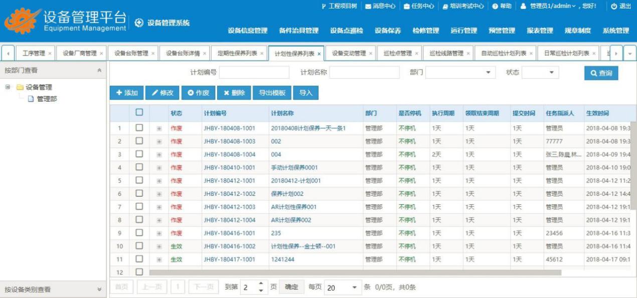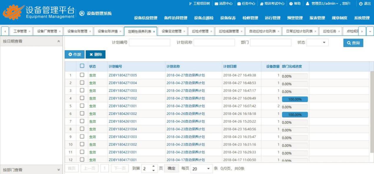 根據設備保養(yǎng)周期自動生成保養(yǎng)計劃,根據完成程度顯示進度,功能包括:作廢、刪除。實現系統(tǒng)根據設備保養(yǎng)周期自動發(fā)起。