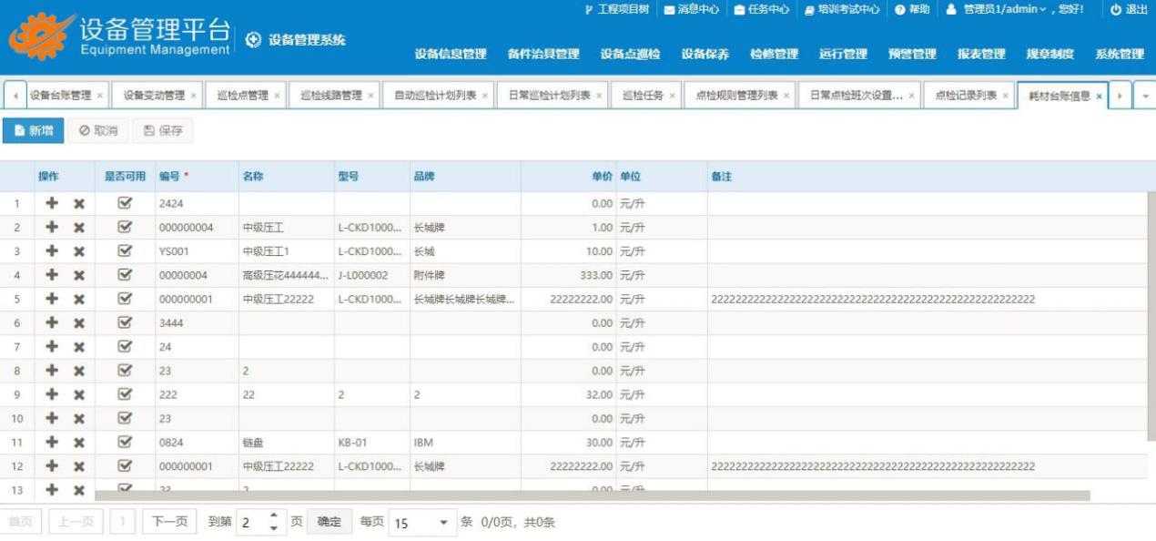 建立保養(yǎng)物資信息臺賬,功能包括:增、刪、改、查。根據物料管理模塊和庫存模塊,建立保養(yǎng)物資信息臺賬,功能包括:增、刪、改、查。可查看耗材的名稱、型號、品牌、單價、單位、用途、備注等。