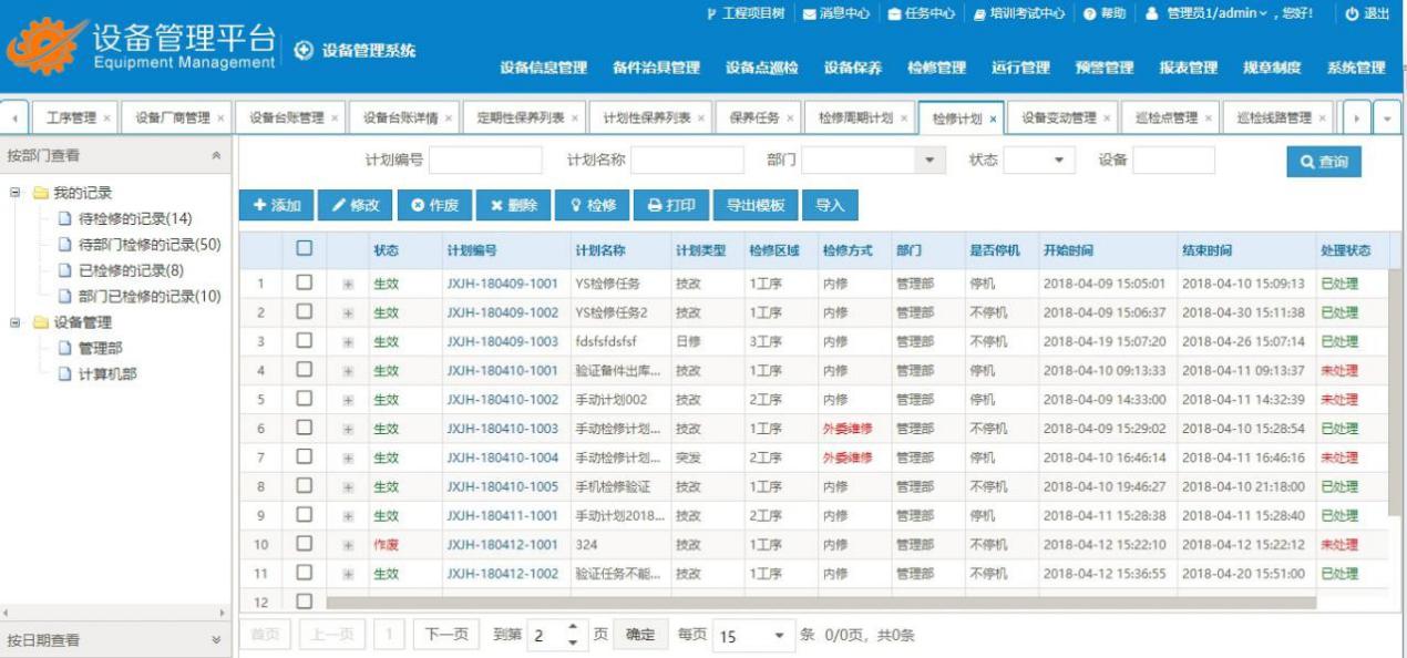 制定設備檢修計劃,獲取設備臺賬檢修標準項建立設備檢修計劃,并實現執(zhí)行信息記錄,功能包括:新增、修改、作廢、刪除、導入、導出、流程審批。實現系統(tǒng)根據設備檢修周期自動發(fā)起計劃。內容包括:狀態(tài)、計劃編號、計劃名稱、計劃類型、檢修區(qū)域、檢修方式、部門、是否停機、開始時間、結束時間、處理狀態(tài)。