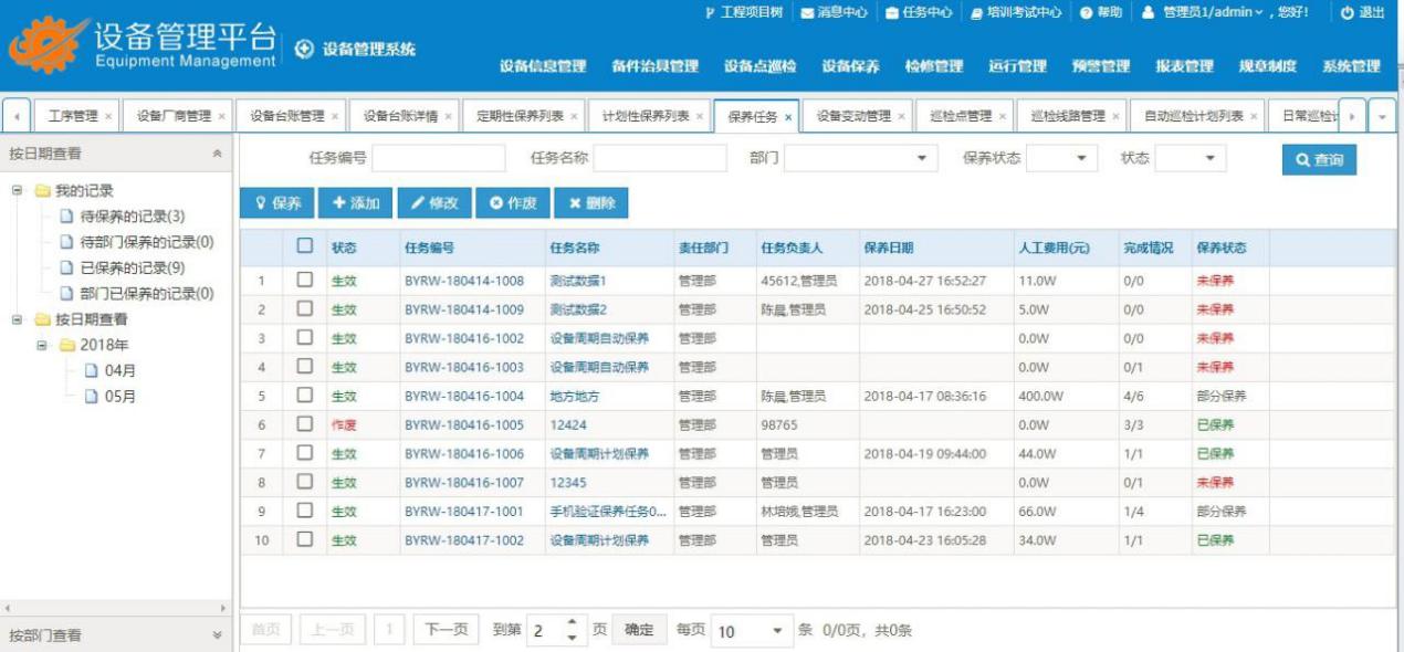 根據設備臺賬工序保養(yǎng)標準設置保養(yǎng)計劃中所需保養(yǎng)項目,功能包括:新增、修改、禁用、啟用等。根據設備臺賬中的設備工序管理中的保養(yǎng)技術標準,進行保養(yǎng)任務安排。根據設備保養(yǎng)周期自動生成保養(yǎng)計劃和人工添加保養(yǎng)計劃,根據完成程度顯示進度,功能包括:作廢、刪除。實現系統(tǒng)根據設備保養(yǎng)周期自動發(fā)起。
