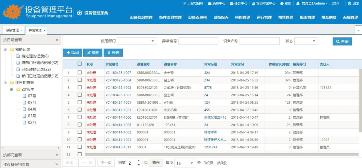 記錄設備異常信息,并執(zhí)行缺陷處理記錄,功能包括:增、改、處理、流程審批。功能包括:增、改、處理。內容包括:狀態(tài)、異常編碼、發(fā)現時間、異常標題、設備編號、異常時間、停機時長、使用部門、責任人。