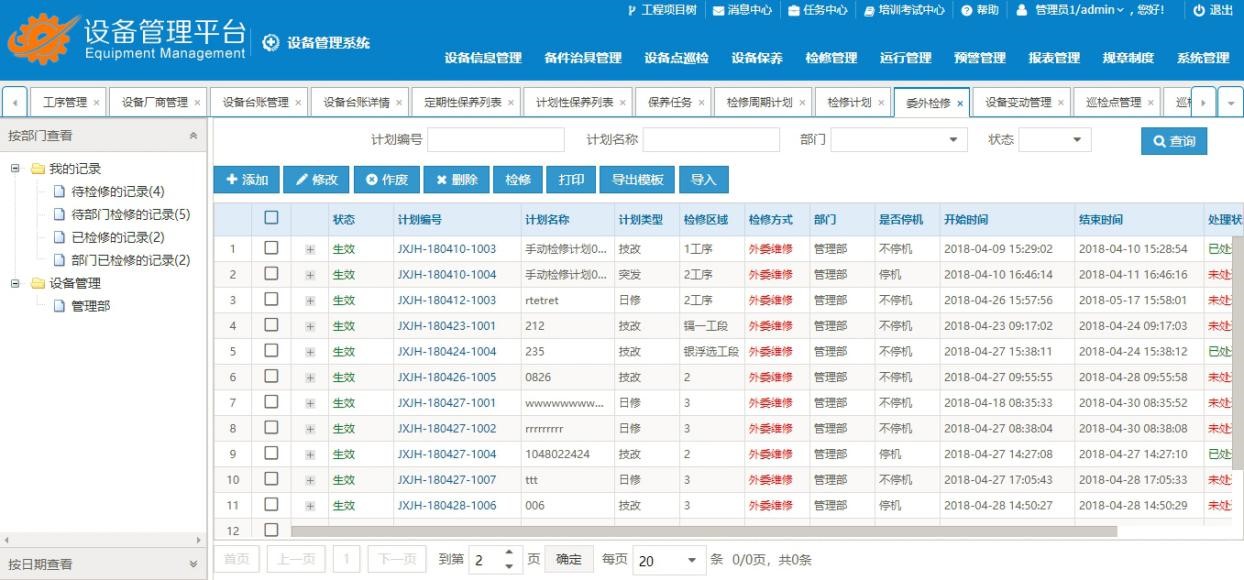 建立設備委外檢修記錄,并實現執(zhí)行信息記錄,功能包括:新增、修改、作廢、刪除、導入、導出。內容包括:狀態(tài)、計劃編號、計劃名稱、計劃類型、檢修區(qū)域、檢修方式、委外單位、是否停機、開始時間、結束時間、處理狀態(tài)。