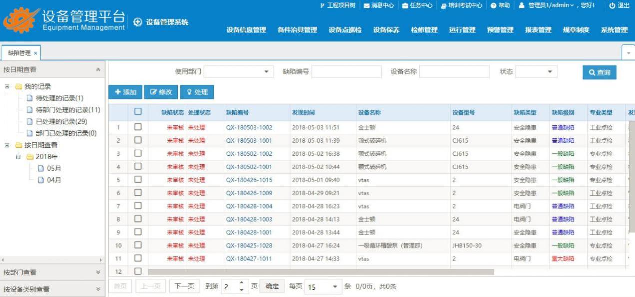 記錄設備缺陷信息,并執(zhí)行缺陷處理記錄,功能包括:增、改、處理、流程審批。內容包括:缺陷狀態(tài)、處理狀態(tài)、缺陷編碼、發(fā)現時間、設備名稱、設備編號、型號、缺陷類型、缺陷級別、專業(yè)類型。