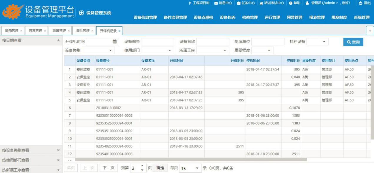 顯示查看設備運行記錄,開停機記錄、點檢記錄、保養(yǎng)、檢修記錄、故障記錄等。內容包括:設備類別、設備名稱、設備編號、開機時間、開機時長、停機時間、停機時長、重要程度、使用部門、使用地點、型號、責任人、廠商。