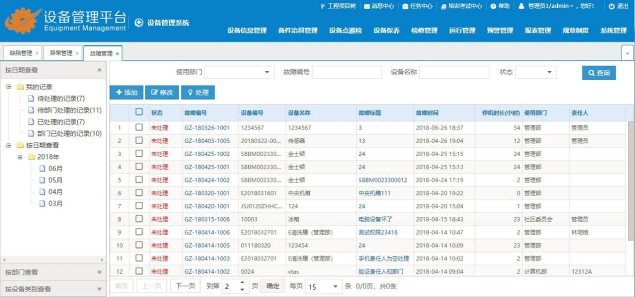 記錄設備故障信息,并執(zhí)行缺陷處理記錄,功能包括:增、改、處理、流程審批。內容包括:待處理故障、已經處理故障、待處理異常、已經處理異常,故障匯總,按實際檢索。