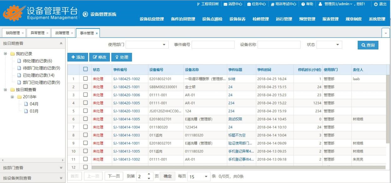 記錄設備事件信息,并執(zhí)行缺陷處理記錄,功能包括:增、改、處理、流程審批。內容包括:狀態(tài)、事件編碼、設備名稱、設備編號、發(fā)現時間、事件標題、事件時間、停機時長、使用部門。