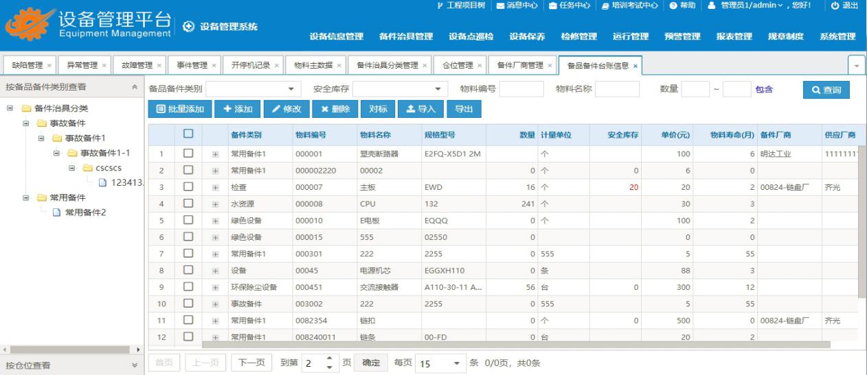 與供應鏈管理系統(tǒng)交互,建立備件物料信息,功能包括:增、刪、改、查、批量添加、導入。